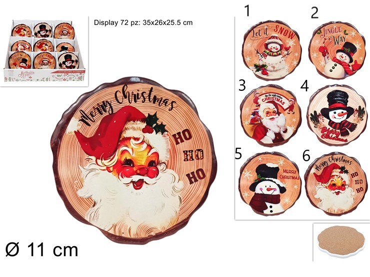 Add festive charm to your table setting with this delightful round Christmas coasters. Featuring cheerful Santa Claus and Snowman illustrations, each coaster is crafted with a durable printed surface and a cork backing to protect your furniture from heat and scratches. Perfect for holiday gatherings, cozy dinners, or simply brightening up your coffee corner.