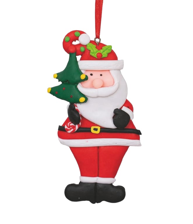Ornament shaped santa made with fimo half green and half red with bow