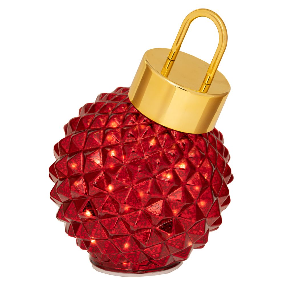 Add a magical glow to your space with this unique ornament-style lantern. Crafted from textured red glass with a shimmering gold top, it brings together classic holiday charm and modern elegance. Soft LED lights inside create a cozy, ambient glow — perfect for mantels, shelves, or as a table centerpiece.