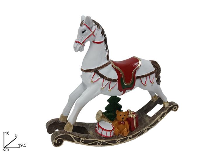 Bring nostalgic charm to your holiday décor with this beautifully detailed rocking horse figurine. Featuring a white horse with a festive red saddle, it rests on an ornate base surrounded by classic Christmas toys including a teddy bear, drum, and gift box.