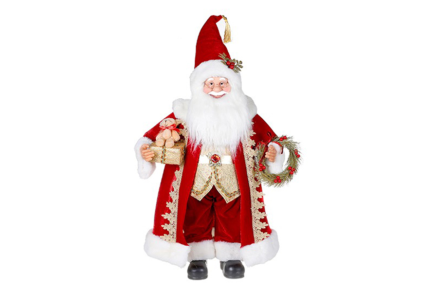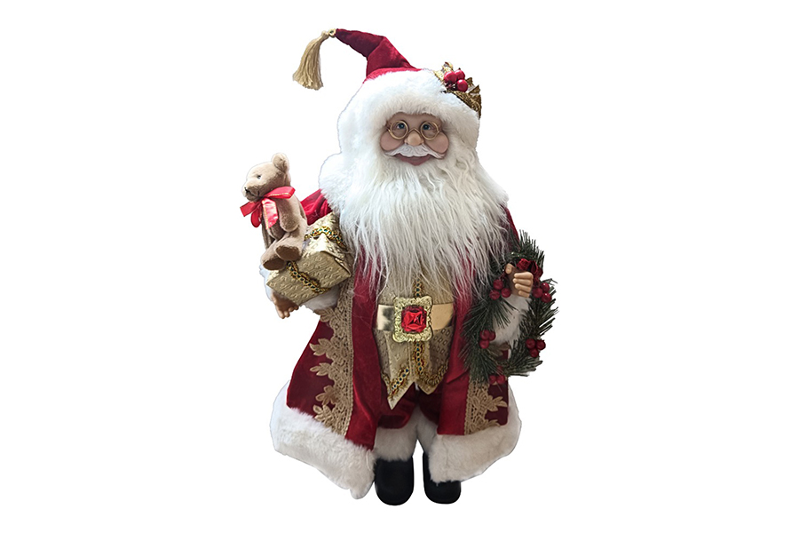 Add a touch of classic elegance to your holiday decor with this beautifully detailed Santa Claus figure, available in three sizes. Dressed in luxurious deep red velvet with white faux fur trim and gold embroidered details, Santa holds a festive holiday wreath in one hand and a cuddly teddy bear in the other. His tall, pointed hat is adorned with a gold tassel and a seasonal floral accent, completing his traditional look.